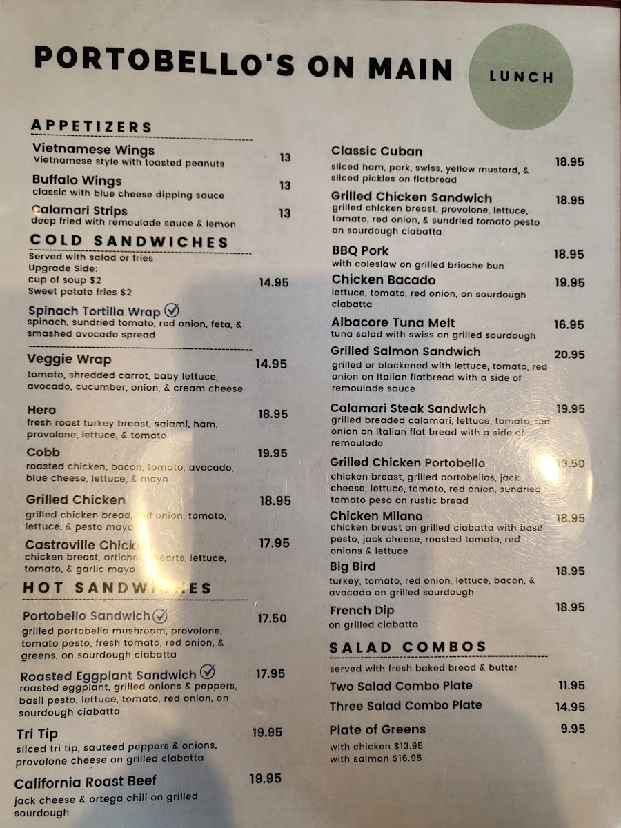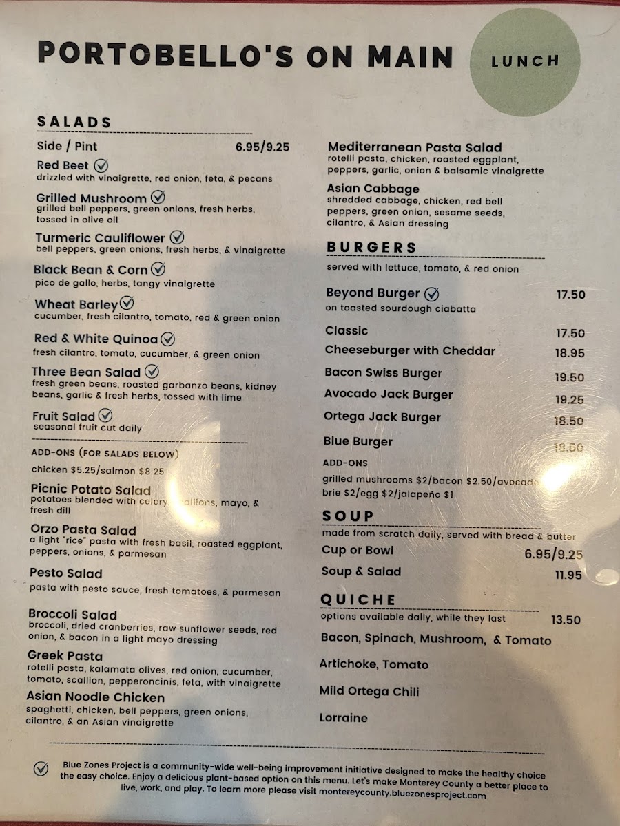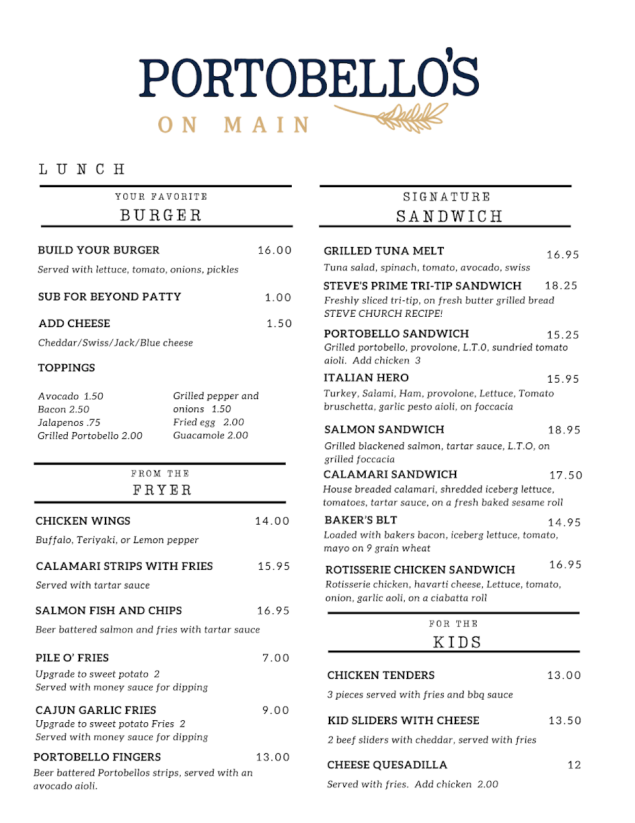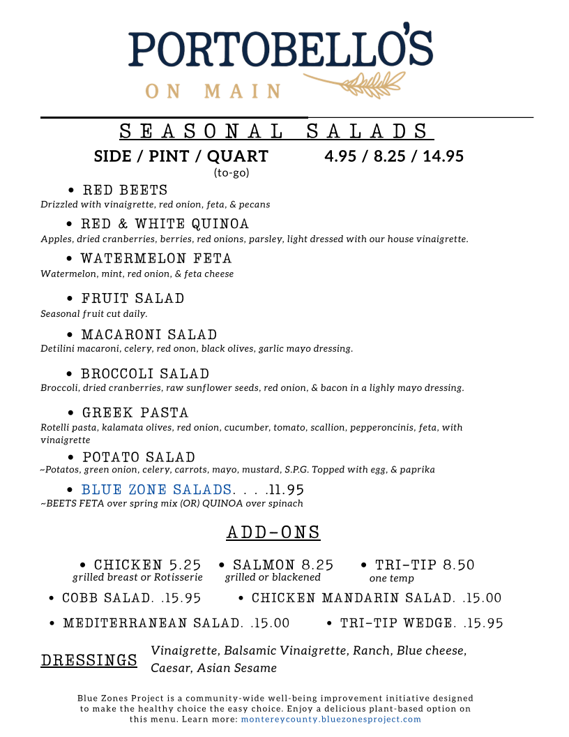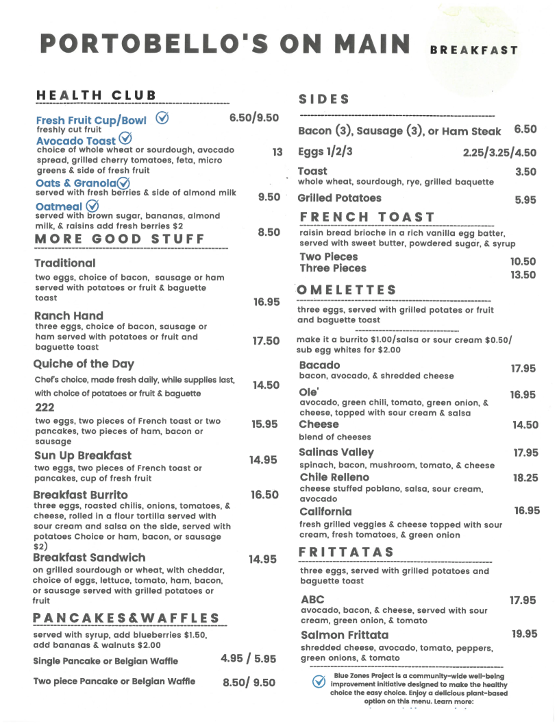From a reviewer’s perspective, the menu at Portobello's On Main feels like a well-rounded breakfast and brunch offering that balances freshness, comfort, and variety. The lighter HEALTH CLUB selections, such as Fresh Fruit Cup/Bowl, Avocado Toast, and Oats & Granola Oatmeal, set a wholesome tone for guests looking to start their day clean and energized. Moving into heartier territory, the MORE GOOD STUFF section shines with classic and filling choices like Traditional, Ranch Hand, 222 Sun Up Breakfast, and Breakfast Burrito, which cater to those craving a satisfying, full breakfast plate. For fans of griddle favorites, PANCAKES & WAFFLES deliver simple indulgence through Single Pancake or Belgian Waffle and Two Piece Pancake or Belgian Waffle, while FRENCH TOAST options such as Two Pieces and Three Pieces offer familiar comfort done right. Customization is easy thanks to a solid lineup of SIDES, including Bacon (3), Sausage (3), Ham Steak, Eggs 1/2/3, Toast, and Grilled Potatoes, allowing diners to build their ideal plate. Egg lovers will appreciate the depth of the OMELETTES menu, highlighted by Bacado, Ole’, Cheese Salinas Valley, and Chile Relleno, each suggesting bold flavors and local inspiration. Finally, the FRITTATAS-notably ABC and Salmon Frittata-round out the menu with baked, hearty options that feel both comforting and slightly elevated. Overall, the menu comes together as a thoughtful conclusion to the dining experience: approachable, diverse, and clearly designed to satisfy a wide range of breakfast and brunch preferences.
